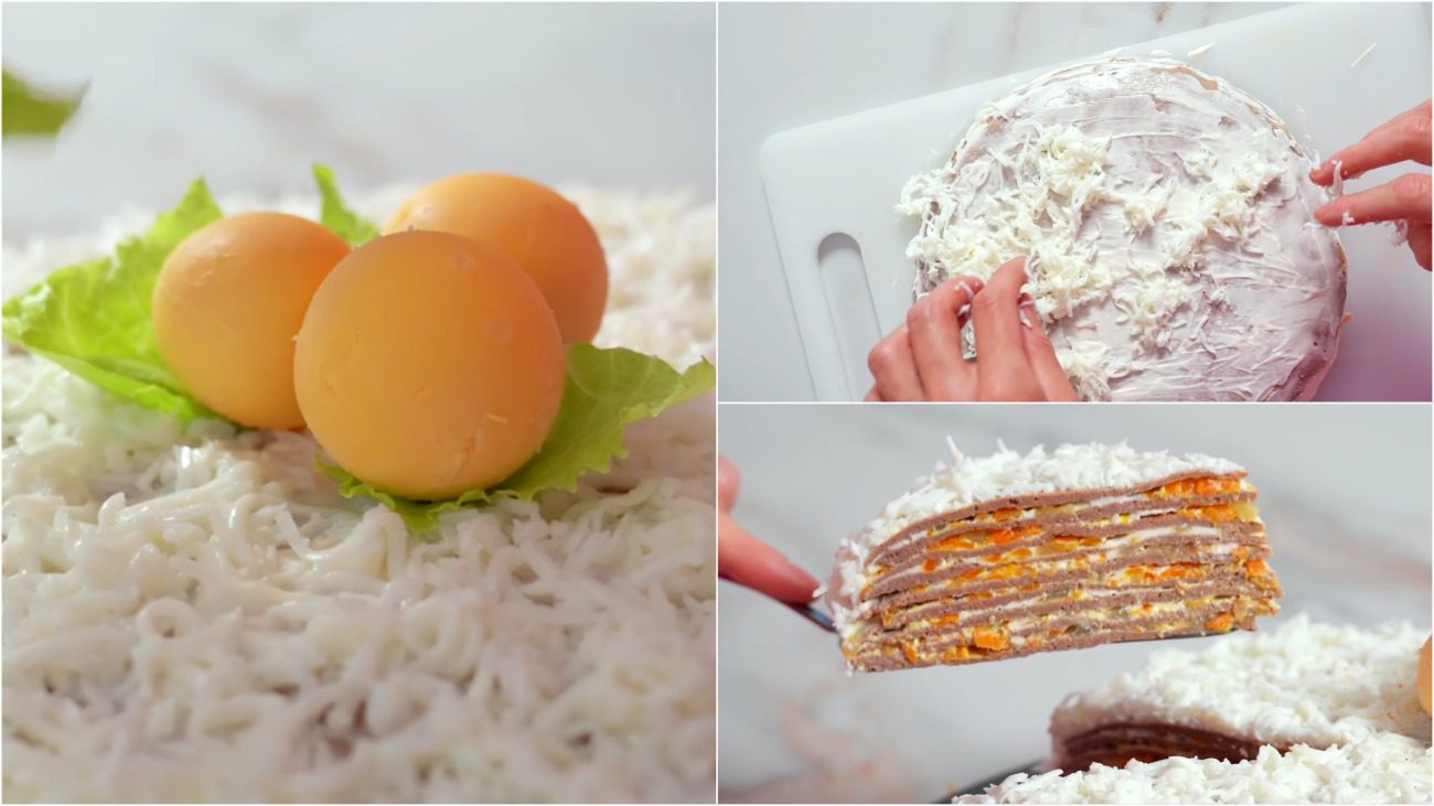 Якщо ви готуєте тортик заздалегідь, то можете накрити плівкою і поставити в холодильник на 4-5 годин, а прикрасити перед самою подачею. Для цього вам потрібно відокремити у варених яєць білки від жовтків. Білки натерти на дрібній тертці та посипати ними торт. Жовтки красиво розставити зверху та прикрасити зеленню.