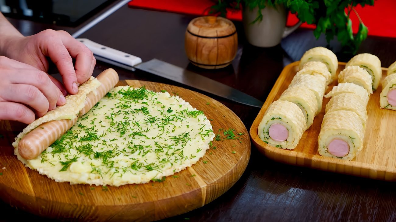 Беремо звичайні вафельні коржі і змащуємо їх шаром гарячого картопляного пюре. Під дією гарячого пюре вафельні коржі буквально через 30 секунд розмокають і стають м’якими та піддатливими. Тоді кладемо на край коржа сосиски (на один лист поміститься 2 сосиски) і загортаємо у рулет. Такі рулетики добре тримають форму.