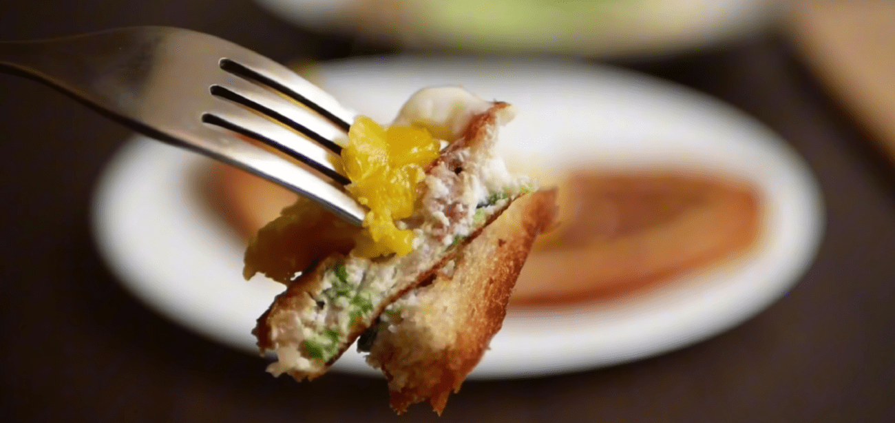 Далі скибочки білого хліба потрібно обсмажити на сковороді. Як тільки утворилася рум’яна скоринка, переверніть і в середину розкладіть начинку з білка, зеленої цибулі і шинки.