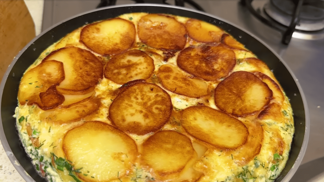 Переверніть запіканку за допомогою тарілки. Залишіть кришку відкритою та готуйте ще 5-7 хвилин. Подавайте із зеленню.