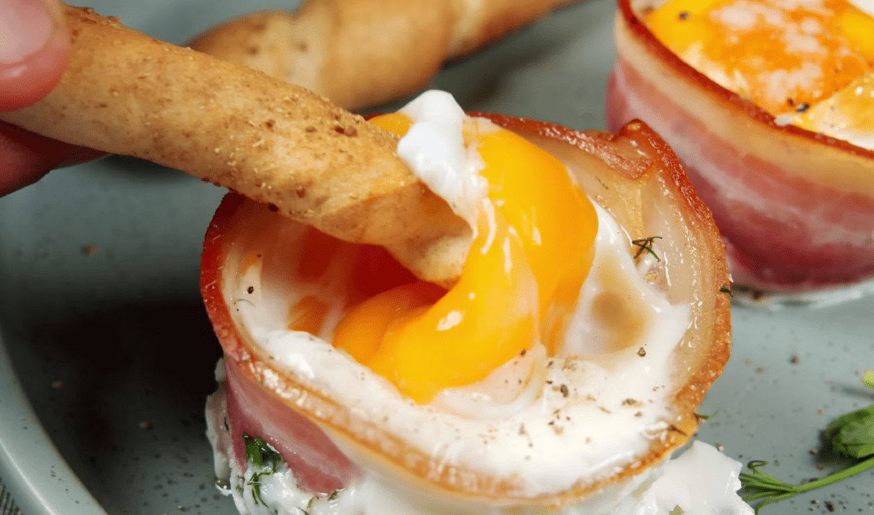 На 6 порцій вам потрібно 6 скибочок бекону. Згорніть їх і покладіть у кожну секцію так, щоб скибочка повністю облягала краї форми.