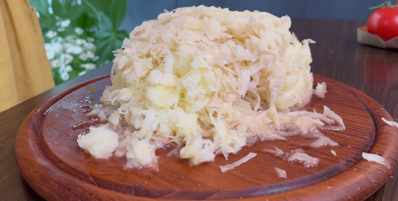 Очищену картоплю натираємо на великій тертці. Тепер перекладаємо його у глибоку тарілку та заливаємо холодною водою. Поки що залишаємо убік.