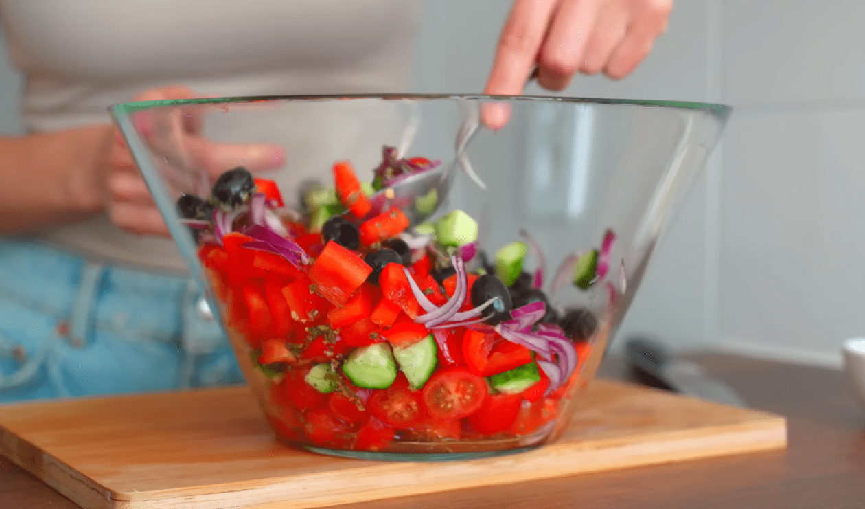 Йдеться про класику середземноморської дієти – улюблений Грецький салат, в якому дотримується ідеальний баланс смаків і текстур. Помідори дають насолоду і кислинку, огірки – свіжість і приємний хрускіт, цибуля та перець додають нотку гіркоти, а солоний кремовий смак Фети та оливки доповнюють повну “картину”.