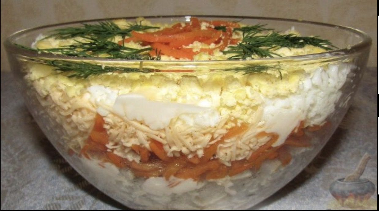 Цей салат одночасно легкий, ситний і дуже смачний. Його готують навіть на дієті, адже він містить білки, корисні жири і мінімум зайвих калорій. Кожен шар компонентів доповнює інший: курка і яйця ніжні, морква по-корейськи пікантна, сир вершковий, йогурт легка основа. Результат, страва, від якої неможливо відірватися, ідеальна для будь-якого столу.
