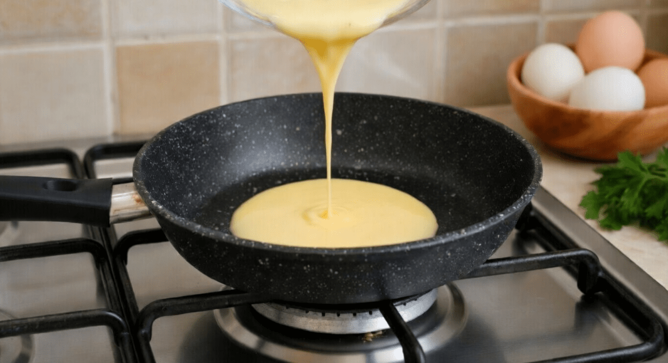 Сковороду ставимо на середній вогонь та добре розігріваємо. Змащуємо невеликою кількістю рослинної чи вершкового масла. Виливаємо в сковороду омлет, накриваємо кришкою і смажимо омлет на повільному вогні близько 5 хвилин з кожного боку.