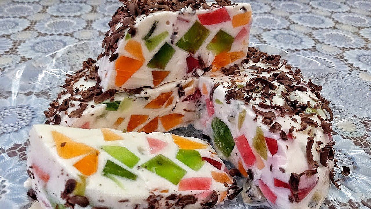 Готовий десерт виходить ніжним, із яскравими вкрапленнями різнокольорового желе – справжня прикраса для святкового столу.