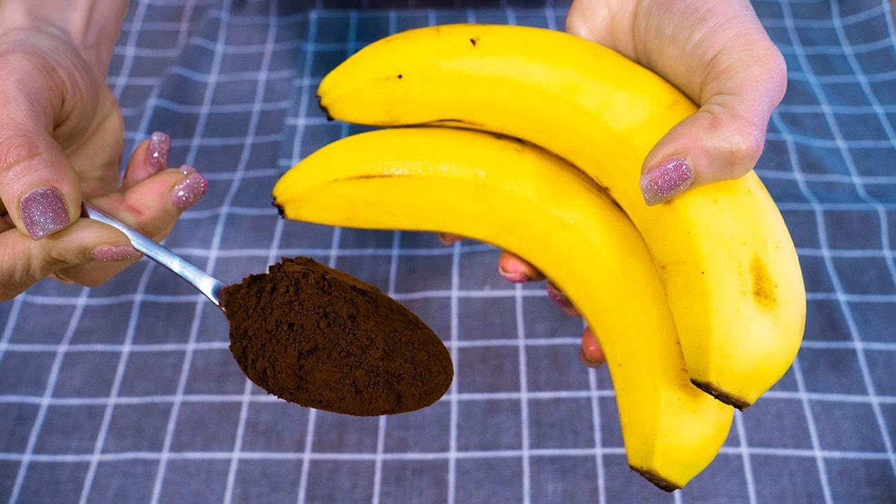 Для приготування тіста для коржа у чашу блендера перекладаємо 2 очищених банана, яйця, дрібку солі, розпушувач тіста і ваніль. Також додаємо какао-порошок і все збиваємо блендером до однорідності. Виходить однорідне, гладеньке тісто, яке за консистенцією нагадує сметану.