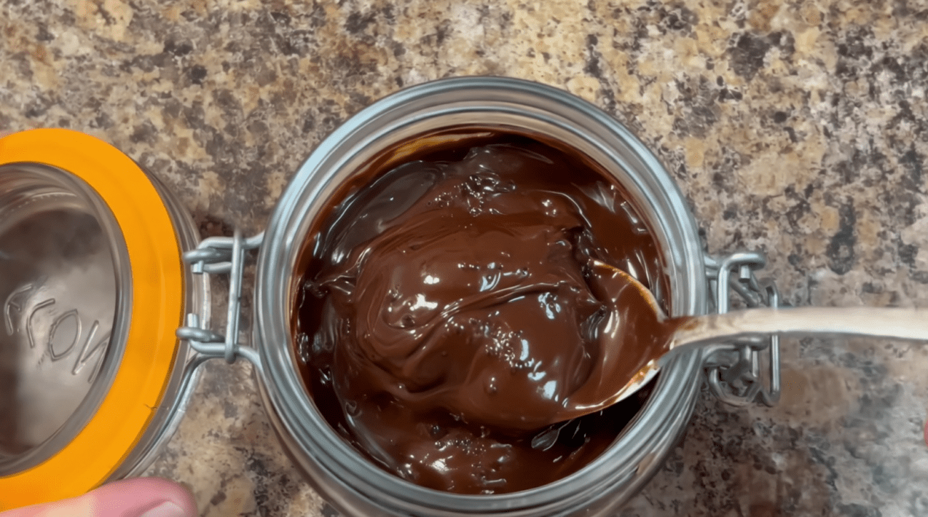 Далі переливаємо шоколадну масу в банку. Остуджуємо при кімнатній температурі і потім щільно закриваємо і ставимо в холодильник мінімум на 3 години, щоб глазур охолола повністю і загустіла.