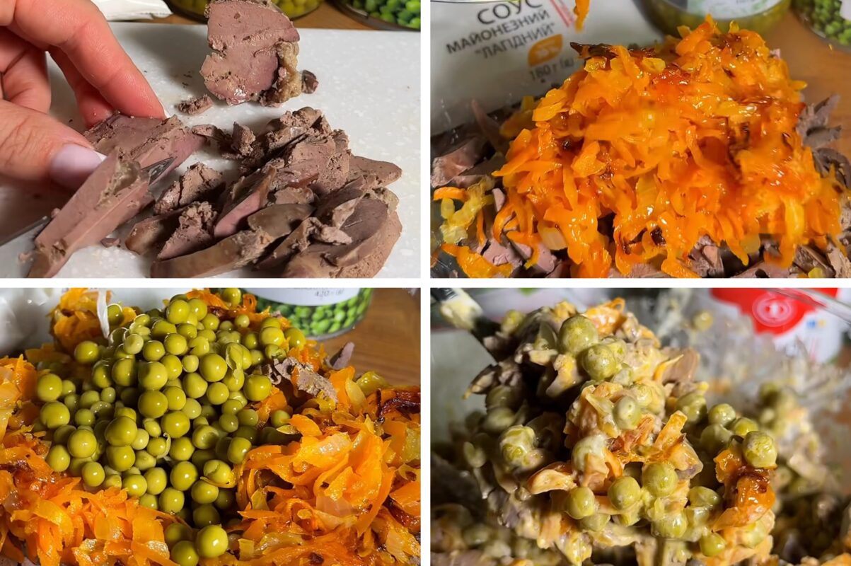Останній етап приготування ситного салату передбачає змішування всіх інгредієнтів у великій мисці. До нарізаної печінки потрібно додати овочеву суміш, зелений горошок, і приправити все чорним перцем, а заправити майонезом. Все гарно перемішуємо. В результаті ви отримаєте нереально смачний салат, який стане ідеальною заміною “Олів’є”. Смачного!