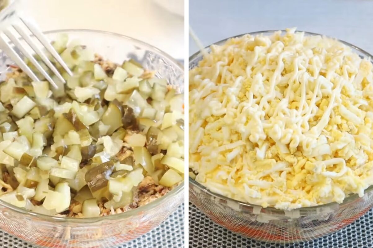 Візьміть салатник та викладіть спочатку шар натертої картоплі, потім майонез, поверх морква, знову майонез. Після цього варто додати шпроти, мариновані огірки, натертий плавлений сир, майонез. Останній шар – це варені яйця, які теж потрібно натерти, викласти і потім нанести майонез. Для декору можна використовувати зелену цибулю та прикрасити салат кількома шпротами.