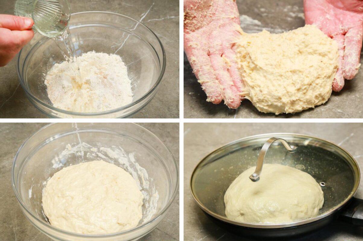 У великій ємності потрібно змішати борошно, сухі дріжджі, сіль і поступово додати теплу воду. Спочатку масу слід перемішати ложкою, а потім перекласти на робочу поверхню й розпочати процес вимішування руками.