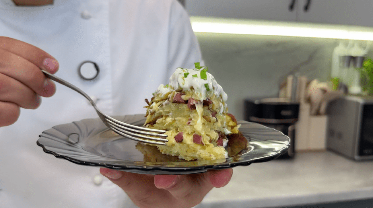 Ця картопля “По-бабусиному” рецепту в 100 разів смачніша за звичайні деруни. Адже це картопляний торт з неймовірно смачним прошарком із мисливських ковбасок, копченої грудинки та сиру, а зверху – ніжний сметанний соус.