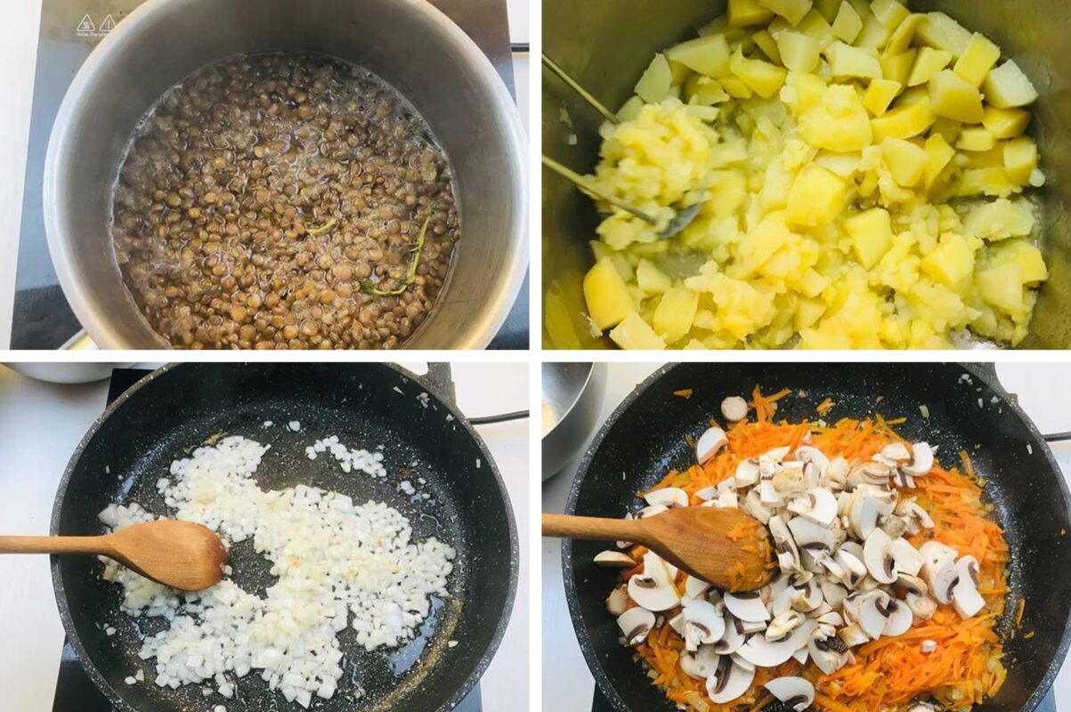 Запропонований нижче рецепт поєднує в собі сочевицю, картоплю та овочі. Такий пиріг підійде всім, адже вважається пісним, однак його можна вдосконалити, додаючи м’ясо. Сочевицю можна замінити на квасолю. Попередньо бобові варто замочити в холодній воді на ніч. Морква повинна бути свіжою та хрумкою. Картоплю краще обирати з високим або середнім вмістом крохмалю.