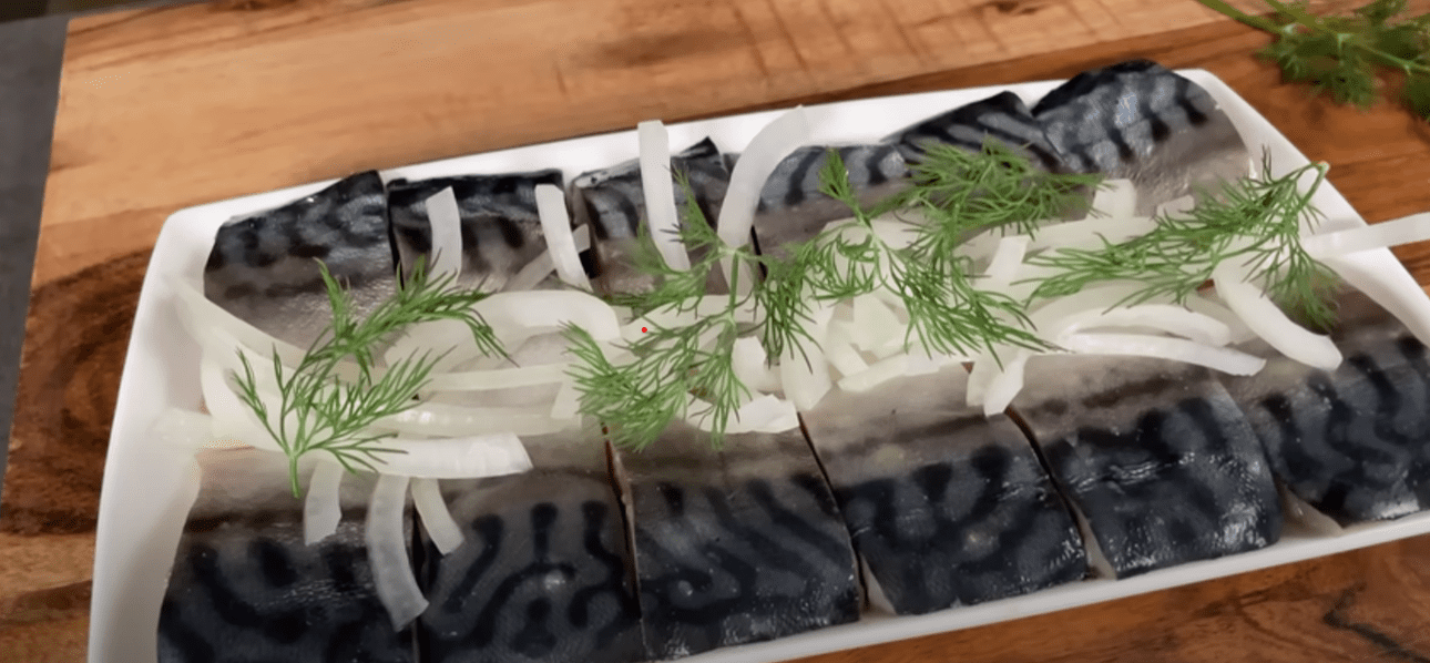 Закриваємо скумбрію у такому стані на ніч. Далі прибираємо залишки солі, за бажанням промиваємо та обсушуємо рибу, і поливаємо її маринадом. Закриваємо на ще 1 ніч.