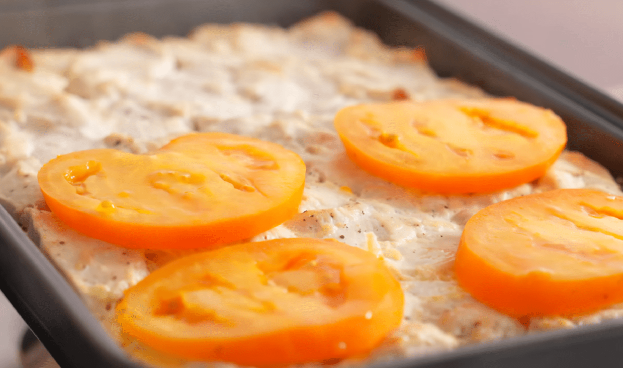 Через пів години дістаємо противень із духовки. Розкладаємо помідори шаром та посипаємо зверху сиром. Запікаємо ще 8-10 хвилин.