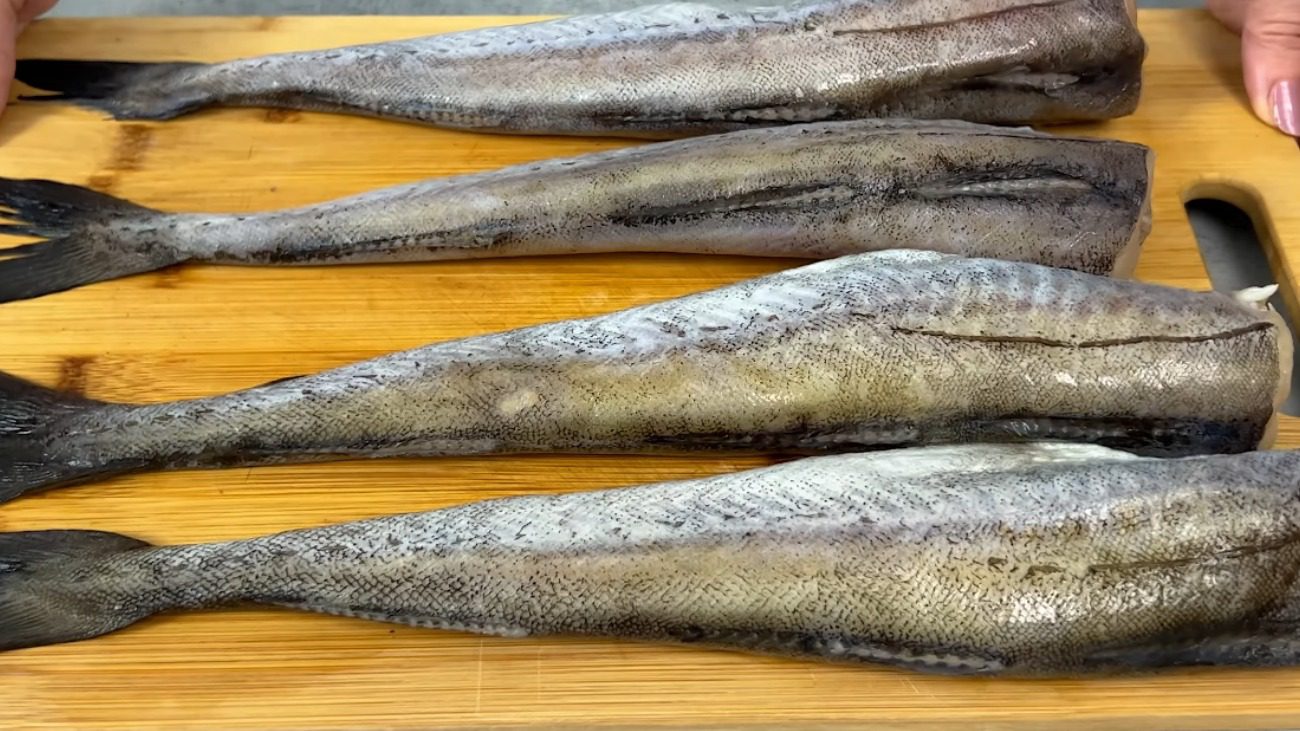 Добре миємо минтай або Хек, видаляємо чорну плівку та відрізаємо хвости. Потім розрізаємо кожну рибку навпіл.