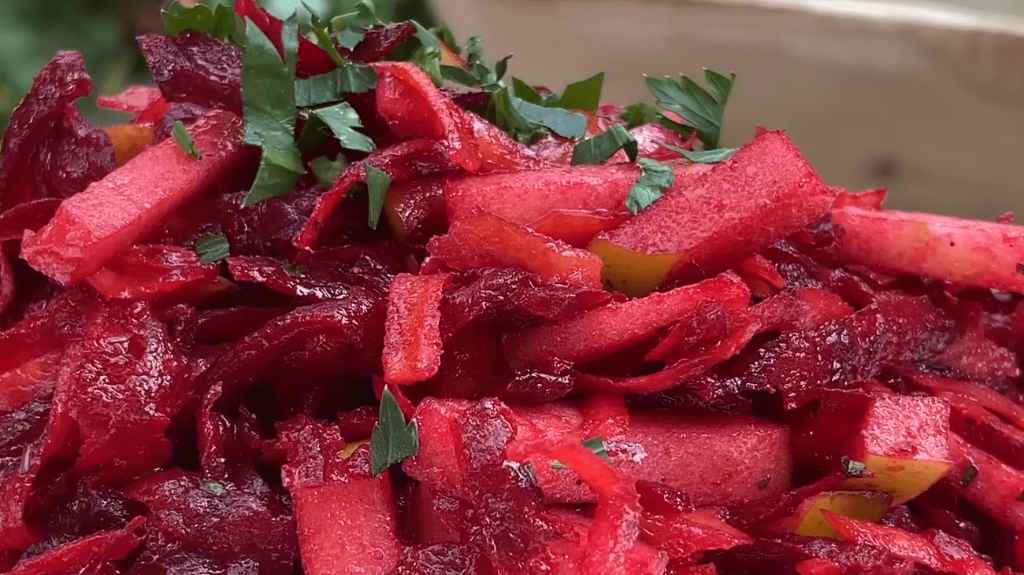 Особливо приємно, що цей салат виходить яскравим і святковим навіть без дорогих продуктів. Його можна подавати як самостійну страву, перекус або доповнення до основних страв. Він не потребує тривалої підготовки: буряк і моркву можна запекти заздалегідь, а яблуко нарізати безпосередньо перед подачею, щоб зберегти свіжість і хрусткість.