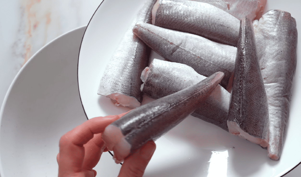 Розморозьте хек за кімнатної температури. Очистіть від луски і відріжте плавці на череві і на спинці. Перекладіть усю рибу у велику миску. Додайте сіль, чорний мелений перець за смаком. Перемішайте.