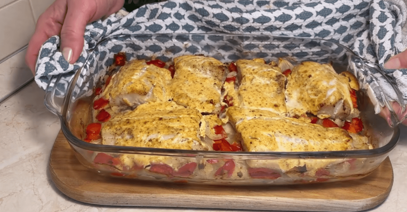 Все, що вам потрібно зробити – це відокремити кістки від філе у риби та нарізати овочі. Потім все скласти у форму для запікання, залити смачним сметанно-гірчичним соусом та відправити до духовки. Менше ніж за годину на вашому столі стоятиме прекрасна вечеря.