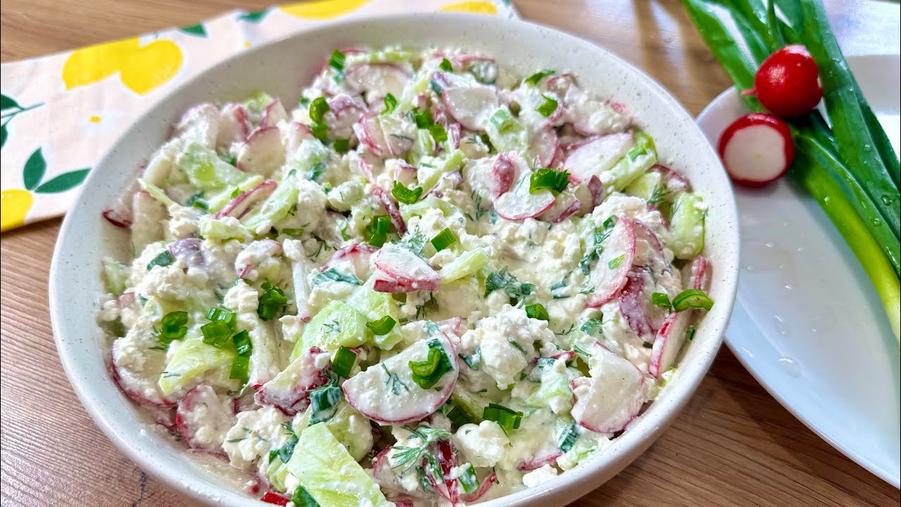 Всі інгредієнти в цьому салаті ідеально поєднуються між собою. Кисломолочний сир додає ніжності і вершковості, а огірки та редис — соковитості і свіжості.