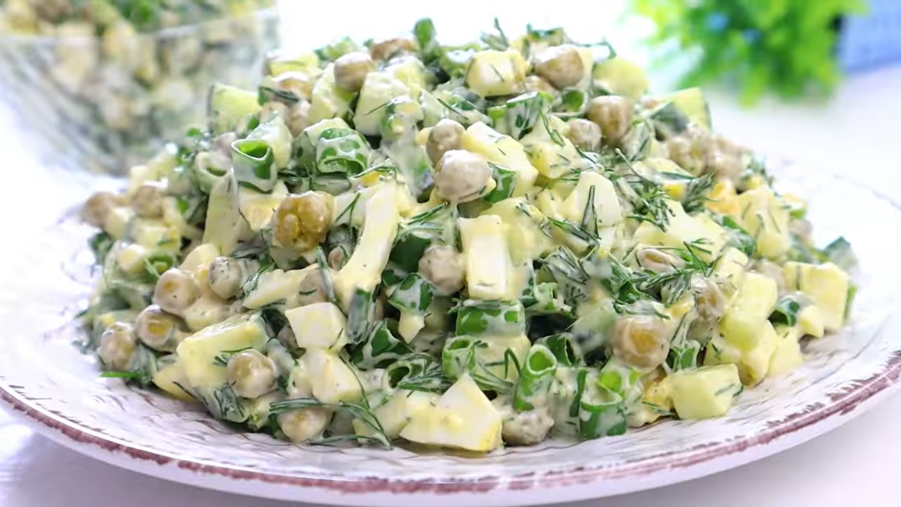 Рецепт смачного та свіжого салату з зеленим горошком. Фото: YouTube ВІКА прості рецепти