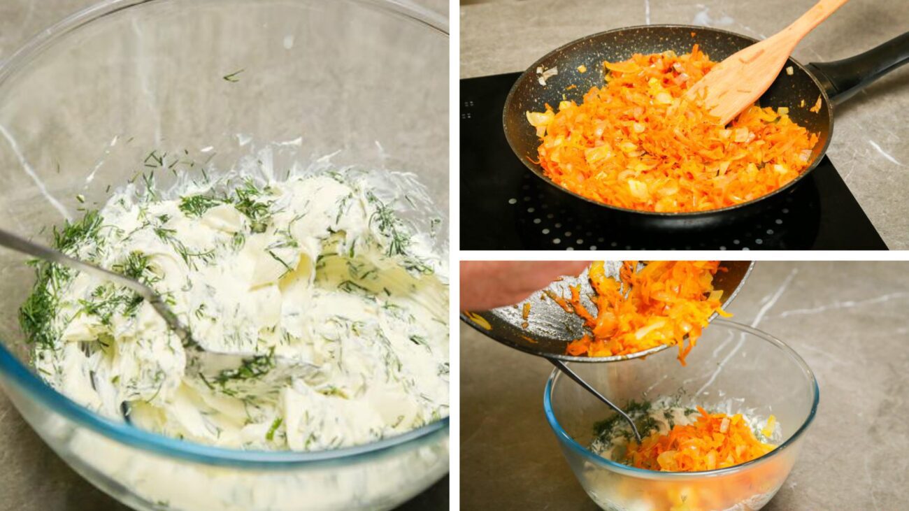 Для начинки потрібно змішати крем-сиром разом із подрібненим кропом і майонезом. Натираємо моркву та нарізаємо цибулю на кубики, все це обсмажуємо, охолоджуємо та змішуємо з сирною основою.
