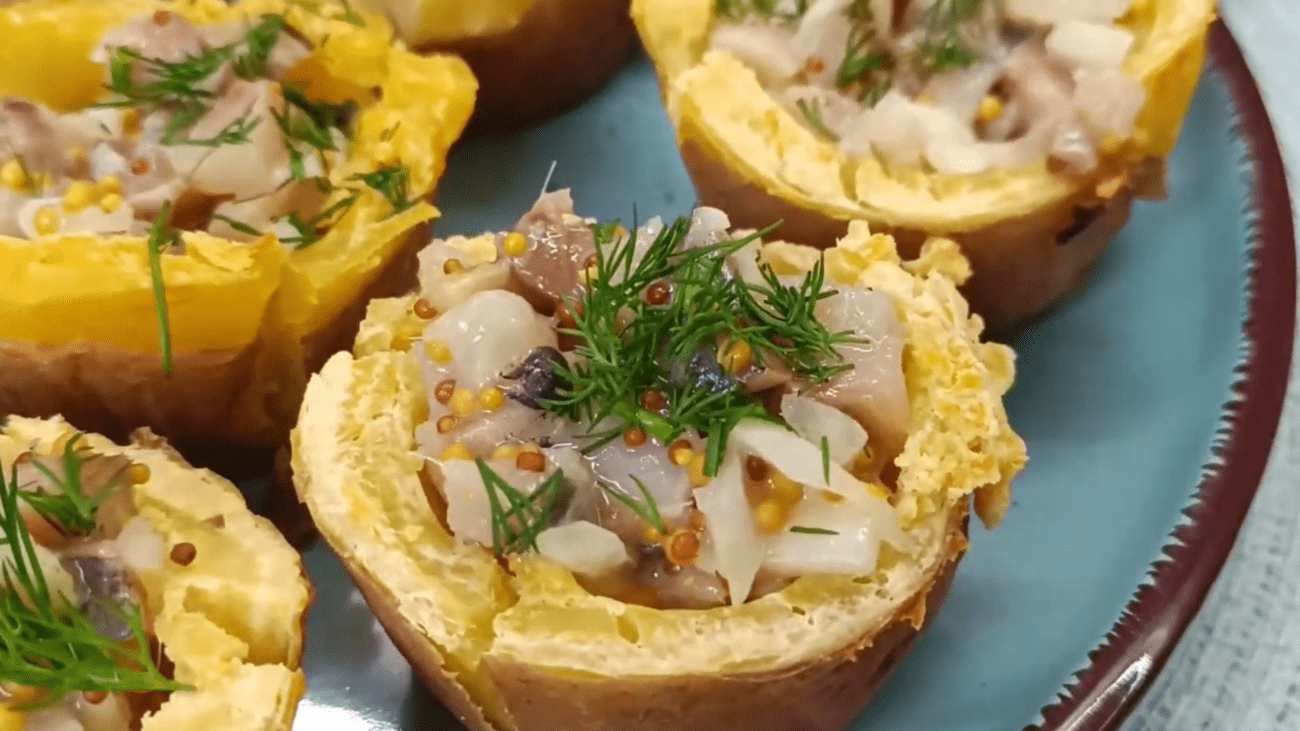 Філе оселедця дрібно нарізаємо, змішуємо з маринованою цибулею, діжонською гірчицею, спеціями та олією й перемішуємо. Таку начинку варто перекласти в кошики картоплі, а перед подачею прикрасити зеленню. Смачного!
