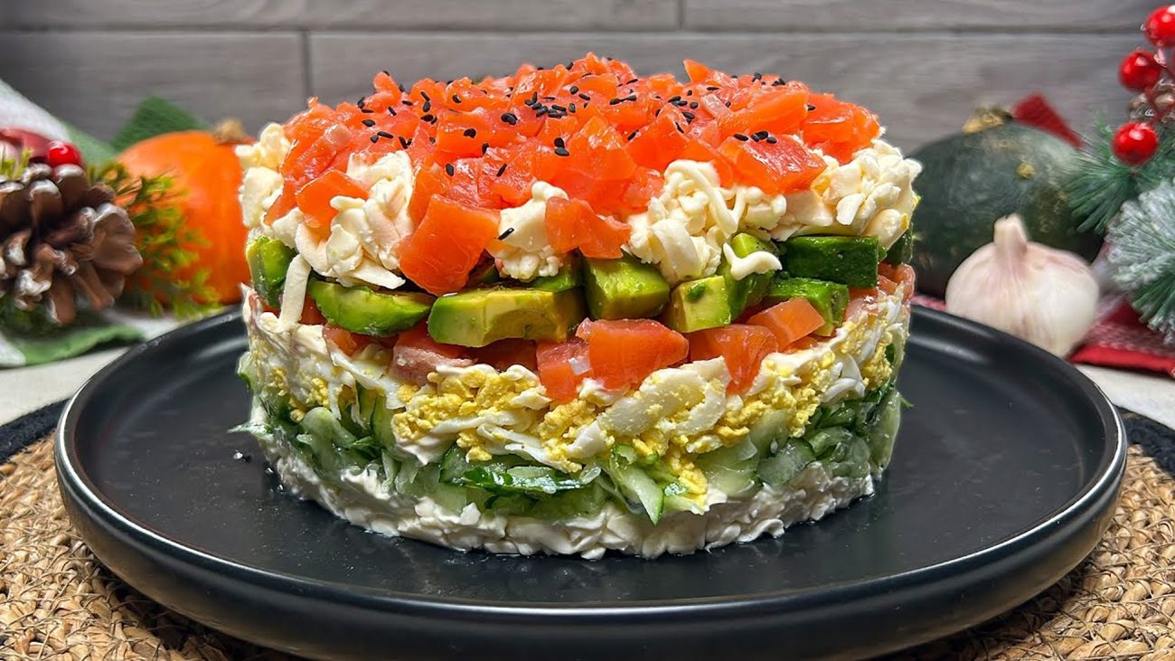 Наступним шаром викладаємо половину всієї підготовленої риби. На рибу викладаємо нарізаний авокадо. Тепер викладаємо другу частину плавленого сиру і робимо сіточку з майонезу. Останнім шаром викладаємо червону рибу, яка залишилась. Зверху прикрашаємо салат чорним кунжутом (за бажанням).