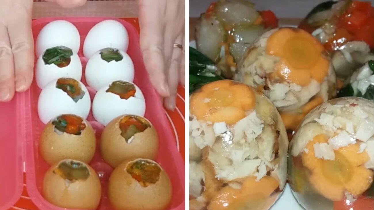 На дно кожної шкаралупи слід викласти шматки перцю та зелень, після чого чергувати шинку, кукурудзу, перець і зелень. Як тільки шкаралупа буде повністю наповнена, в неї потрібно влити теплий бульйон із розчиненим желатином. Підготовлені заготовки необхідно перемістити в прохолодне місце, зокрема в холодильник до застигання.