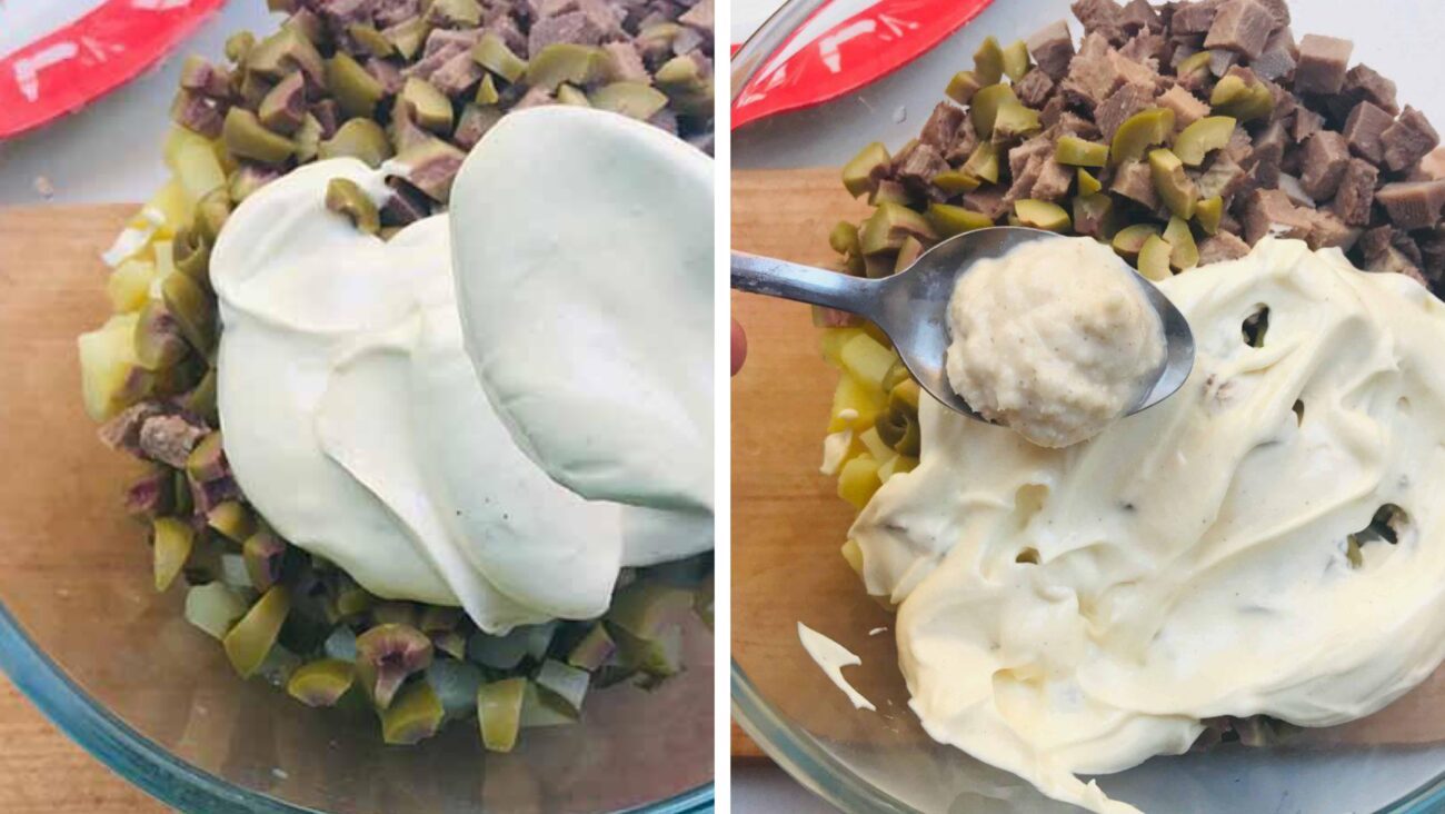 Морква нам більше не потрібна. Язик слід обережно очистити від шкірки та нарізати на кубики і змішати разом із картоплею. Туди ж додаємо подрібнені оливки й солоні огірки. Всі продукти змішуємо й заправляємо майонезом (краще обирати домашній). Нехай смакує!
