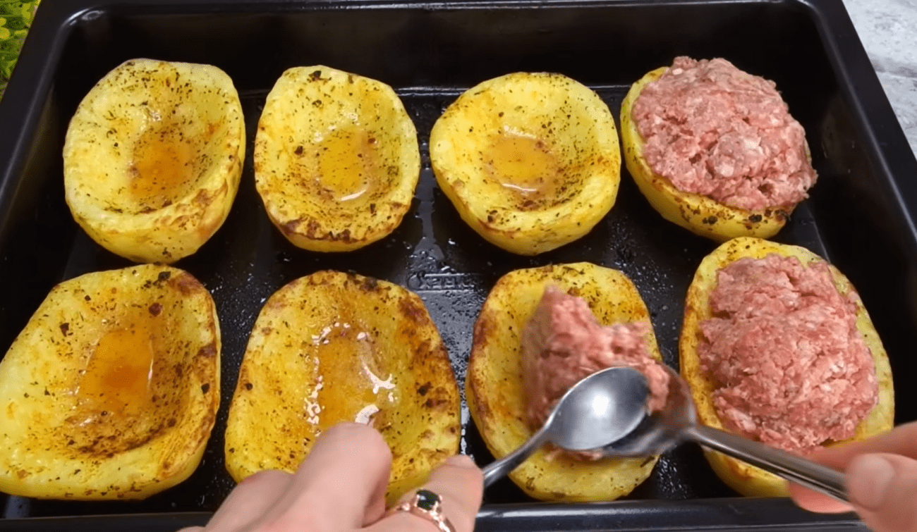 Виймаємо картоплю з духовки і фаршируємо її фаршем.