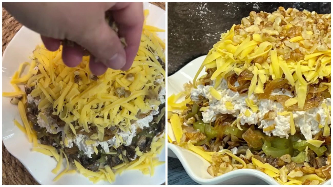 Збираємо салат “Вечірня Одеса”. Курячі грудки розділяємо навпіл. Одну половину викладаєте на плоску тарілку для подачі. Далі зверху викладаєте всі обсмажені гриби. Тепер додаєте мариновані огірки та половину обсмаженої цибулі. Далі знову м’ясо та 2 половина цибулі. Зверху затираєте салат із сиром і посипаєте залишками волоського горіха.