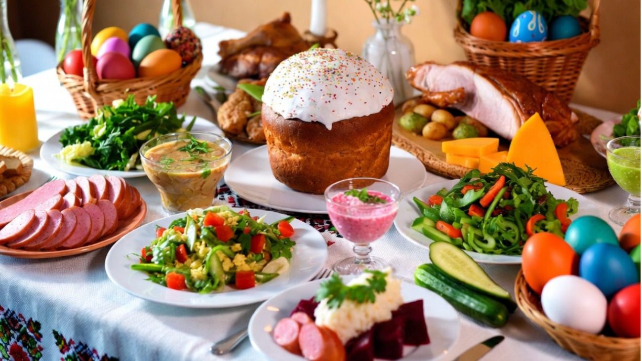 На Великдень зазвичай готують прості, але ситні салати. Це може бути “Вінегрет” або салат із куркою та корейською морквою, а також свіжі овочеві салати із зеленню, огірками та помідорами.