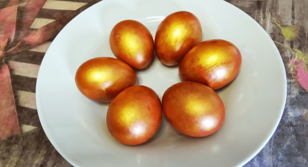 Після того, як всі яйця пофарбовані, додаємо ще жовтий і червоний барвник і дивимося на відтінок. Якщо яйця надто темні, то додаємо більше жовтого. Якщо надто жовті, то більше червоного. Повторюємо процес 3-4 рази, поки не досягнете потрібного красивого золотого відтінку.
