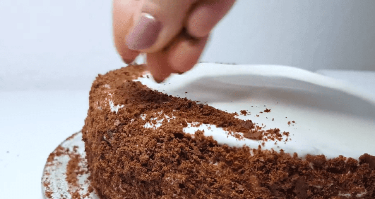Збираємо торт. Кожен корж рясно змащуємо кремом. Щоб закріпити торт, змащуємо боки. Прикрашаємо крихтою.