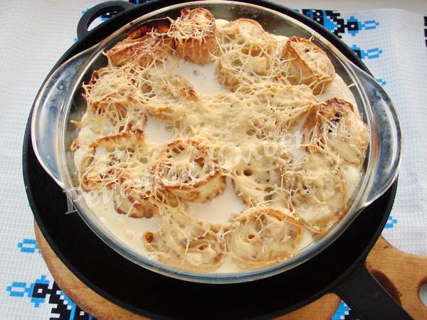 Змастіть форму для запікання маслом. Викладайте млинці шарами, чергуючи з куркою і сирним соусом. Перший шар — млинець, зверху трохи курки, потім соус, повторюйте до кінця інгредієнтів. Верхній шар повинен бути покритий соусом і сиром, щоб запіканка вийшла золотистою та соковитою. Розігрійте духовку до 180 градусів. Запікайте 25–30 хвилин до появи золотистої скоринки.