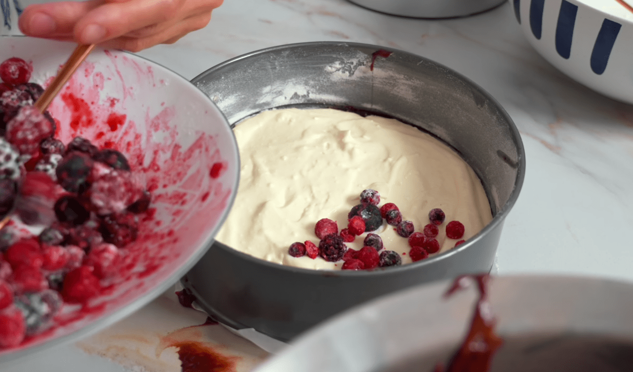 У форму діаметром 20 см змащуємо вершковим маслом і потім посипаємо борошном. Виливаєте половину шоколадного тіста. Обережно розподіліть по всій формі. Зверху викладаєте шар сиру, а потім шар ягід. Заливаєте залишком тіста.