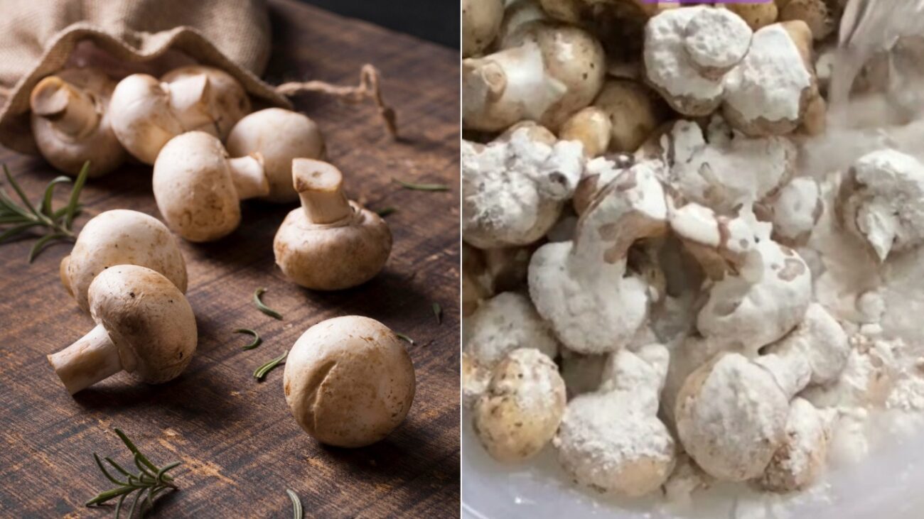 Щоб застосувати фокус – пересипте печериці в окрему глибоченьку миску. А далі – посипте їх борошном так, щоб воно тонким шаром вкривало кожен грибочок. Імовірно, вам доведеться додатково розподілити борошно руками між усіма печерицями рівномірно.