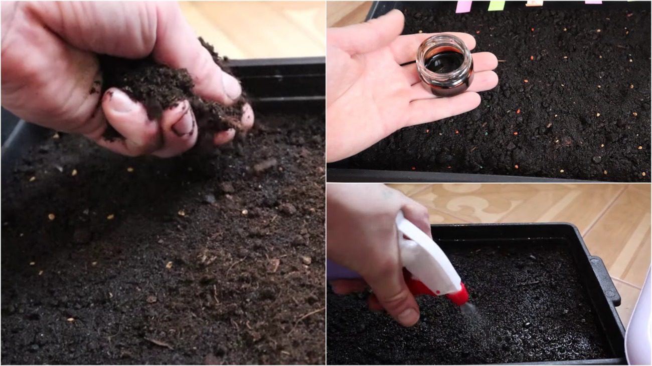 Потім ґрунт засипають у підготовлену загальну тару, залишаючи 2-3 см від краю. Тепер потрібно трохи ущільнити землю, щоб створити рівну поверхню. Після цього ретельно обприскуємо ґрунт із пульверизатора. Тепер розкладаємо насіння рядками на відстані між насінням 3 см, а між рядами 4-5 см. Потім присипаємо зверху землею приблизно на 2 см і трохи ущільнюємо.