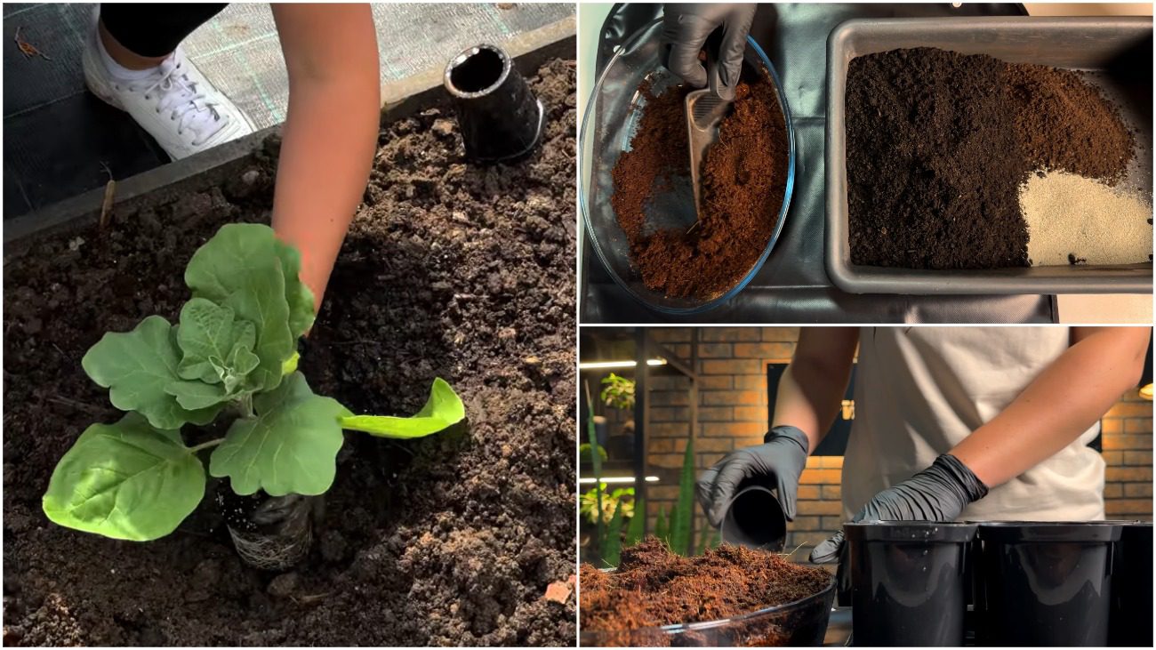 Оскільки розсада баклажанів любить легкий поживний повітропроникний ґрунт без застою води. Ідеальний склад: 2 частини некислого торфу + 1 частина біогумусу + 1 частина розпушувачів. Все ретельно перемішуємо. Далі наповнюємо склянку субстратом, не досипаючи до краю приблизно 2 см.