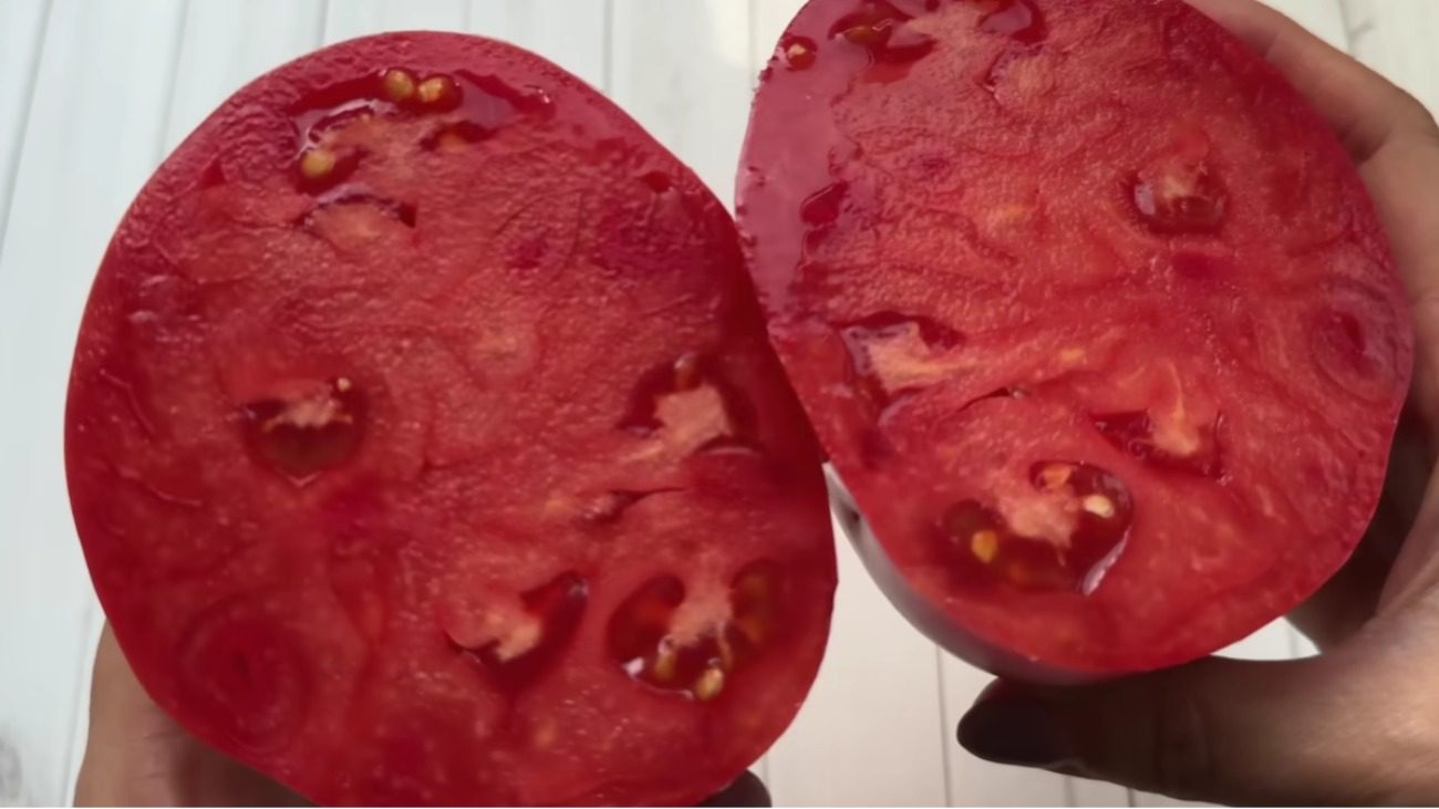 Насамперед цей томат відрізняється від усіх інших своєю щільною та дуже соковитою м’якоттю. Це потужні важкі томати, рівні, трохи сплющені з боків середньою вагою від 400 до 900 г. У них дуже гарний насичено рожево-малиновий колір, який на вершині переважно яскравіший.
