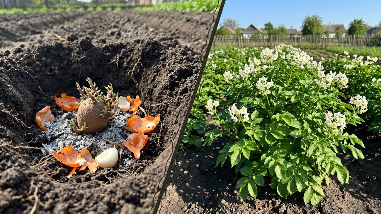Для підсилення можна додати кілька зубчиків часнику у лунку прямо з бульбою. Розкладаються вони повільно та, аналогічно цибулевому лушпинню, виділяють фітонциди, які відлякують жука.