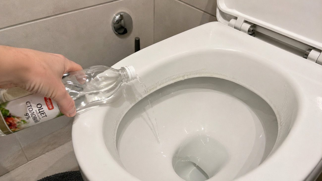 Робиться це дуже просто. Спочатку зливають воду, щоб рівень у чаші став нижчим і оцет дістав саме до проблемного місця. Потім вливають 1-2 склянки білого оцту по стінках, особливо там, де видно іржу або кам’яний обідок.