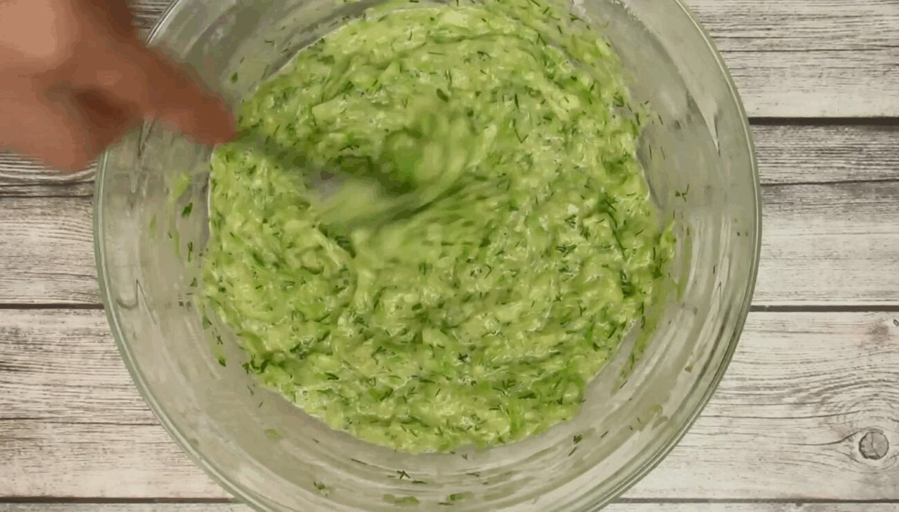 Кабачки натираємо на крупній тертці і відразу додаємо до кабачків пів чайної ложки солі та перемішуємо. Даємо постояти кабачкам 5 хвилин і добре відтискаємо сік, який утворився.