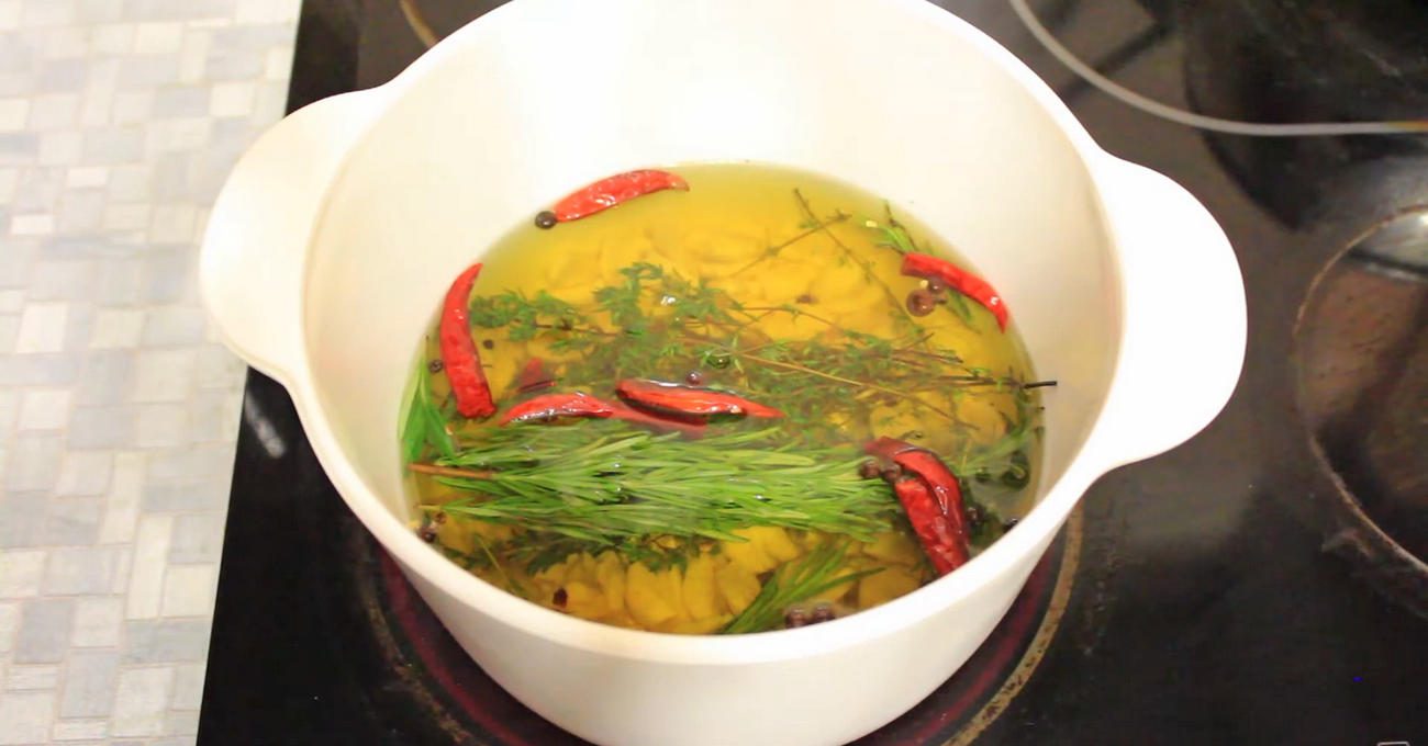 Готується така ароматна смакота дуже просто. Для цього потрібно взяти олію без запаху. Найкращі підходять для ароматизації рафіновані соняшникова та оливкова. На стандартну порцію знадобиться всього 100 мл, але можете одразу готувати більше. Олію наливайте в сотейник чи сковорідку (обов’язково чисту, а не після смажіння чогось) і ставте на невеликий вогонь. Олія має бути прогрітою, але не надто гарячою, щоб не починала диміти.