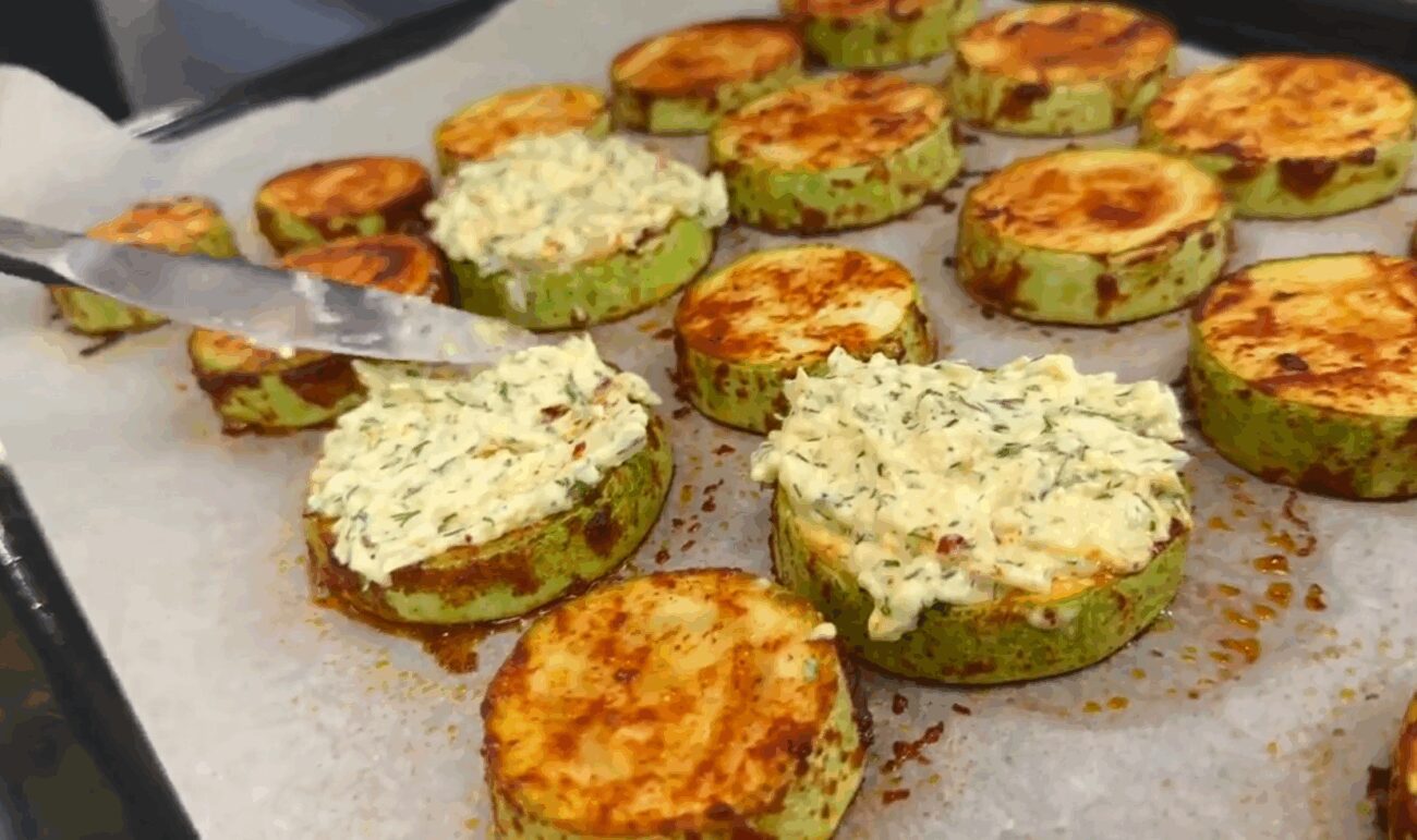 Виймаємо напівготові кабачки з духовки. Далі на кожен шматок кабачка викладаємо трохи сирної маси і знову ставимо їх у духовку на 2 хвилини, щоб сир розплавився.