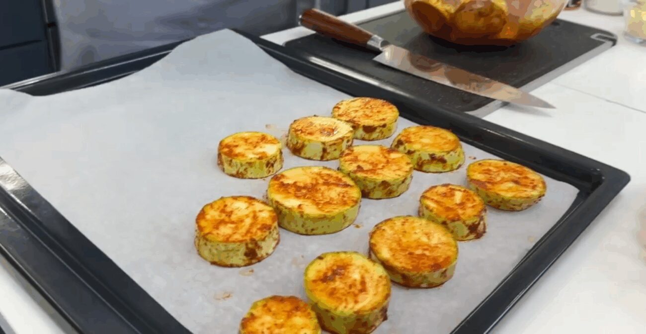 Деко застеляємо пергаментним папером і викладаємо кабачок. Духовку зарання розігріваємо до температури 180 градусів. Ставимо кабачки випікатися на 15 хвилин.