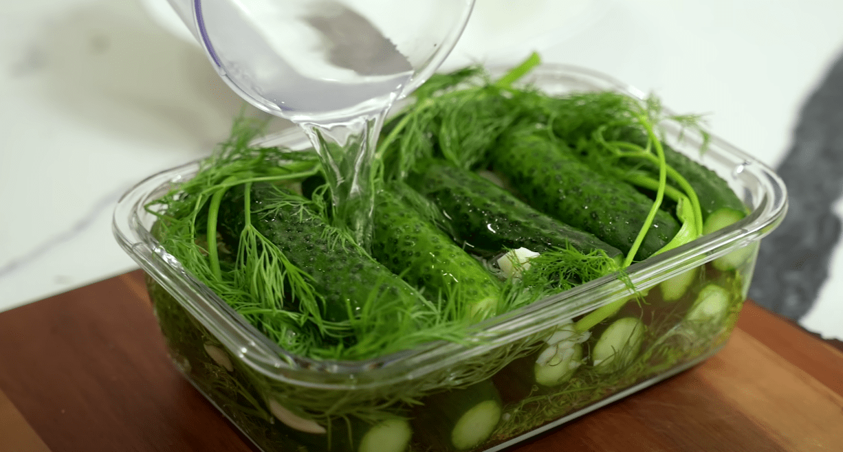 Зверху огірків викладаємо ще пару гілочок кропу та заливаємо водою з цукром та сіллю. Огірки мають бути повністю вкриті розсолом.