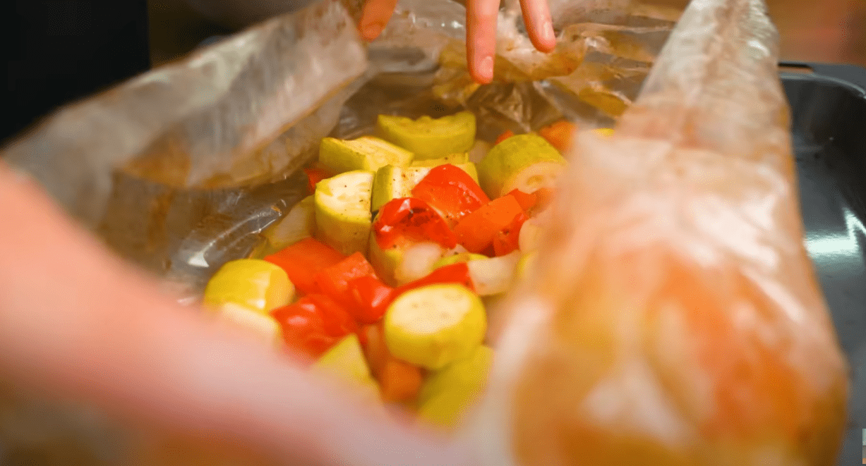 Всі овочі – кабачки, морква, цибуля, помідори та болгарський перець нарізаємо на великі кубики. Далі їх потрібно покласти у великий кулінарний рукав, посолити, поперчити, додати трохи рослинної олії і все добре перемішати. Не забудьте добре зафіксувати рукави з іншого боку.