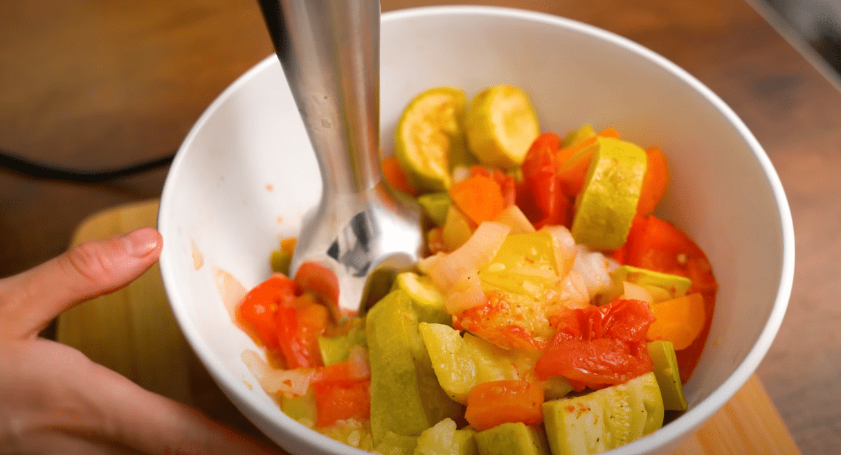 Далі буде найвідповідальніший момент – подрібнення овочів. Це можна зробити за допомогою м’ясорубки або блендера. Якщо кабачкова ікра виходить густою, можна розбавити її невеликою кількістю соку. За потреби додати спецій.